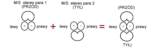 ”Double M/S” is an improved version of the well-known M/S stereo recording technique. In addition to a frontfacing cardioid or supercardioid ”mid” microphone and a figure-8 ”side” microphone, a rear-facing directional microphone is set up.
